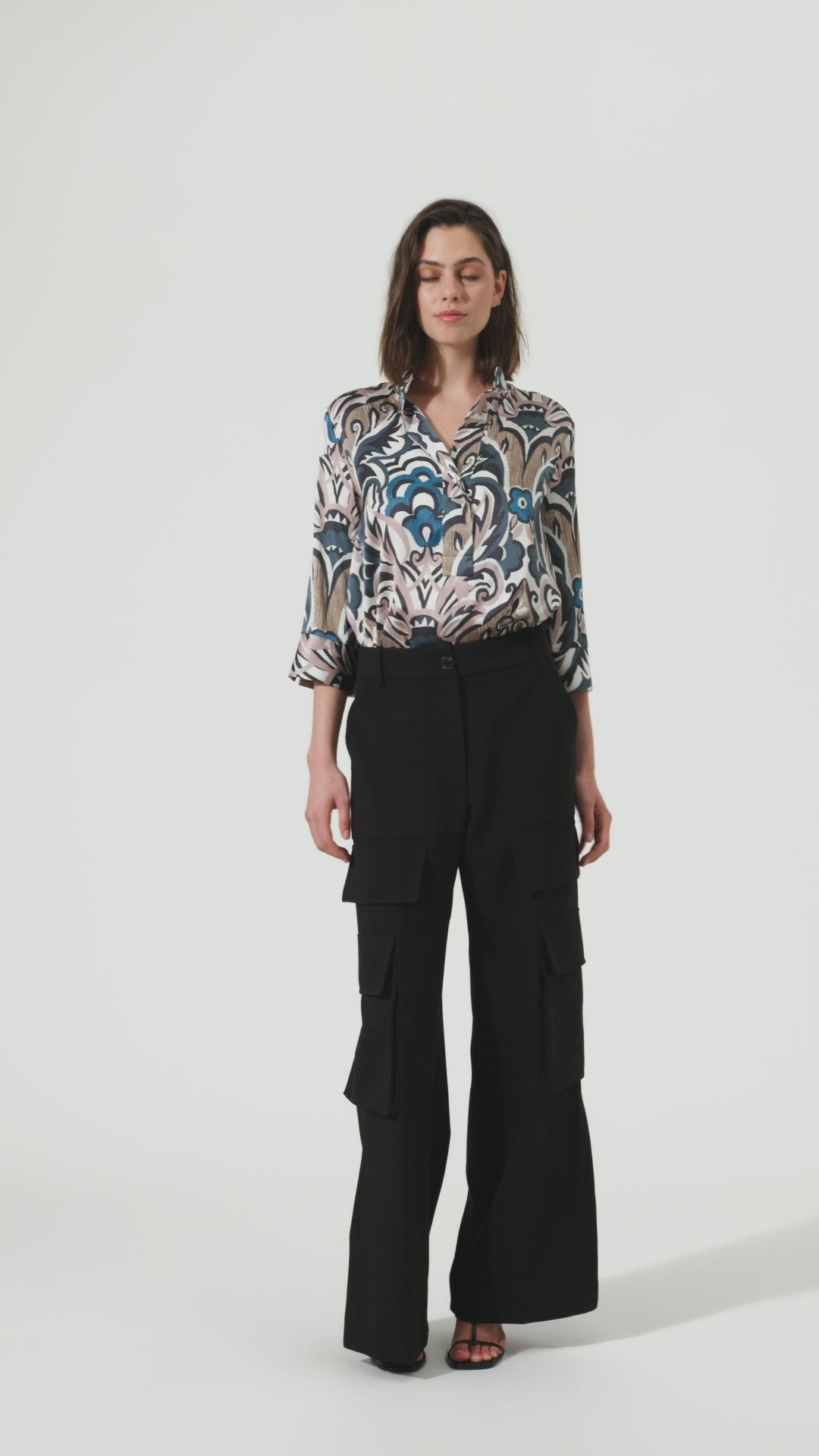 Blusen er designet med et farverigt all-over print, 3/4 ærmer og en ret krave. Langs midten ved brystet findes en skjult knapstolpe.