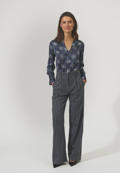Denne bluse er fremstillet i en luksuriøst silke med stretch i en mørkeblå nuance prydet med smukke små blomsterbuketter, for et elegant udtryk. Blusen har en loose-fit pasform med lange ærmer, V-halsudskæring og en lidt længere længde bagpå end fortil.