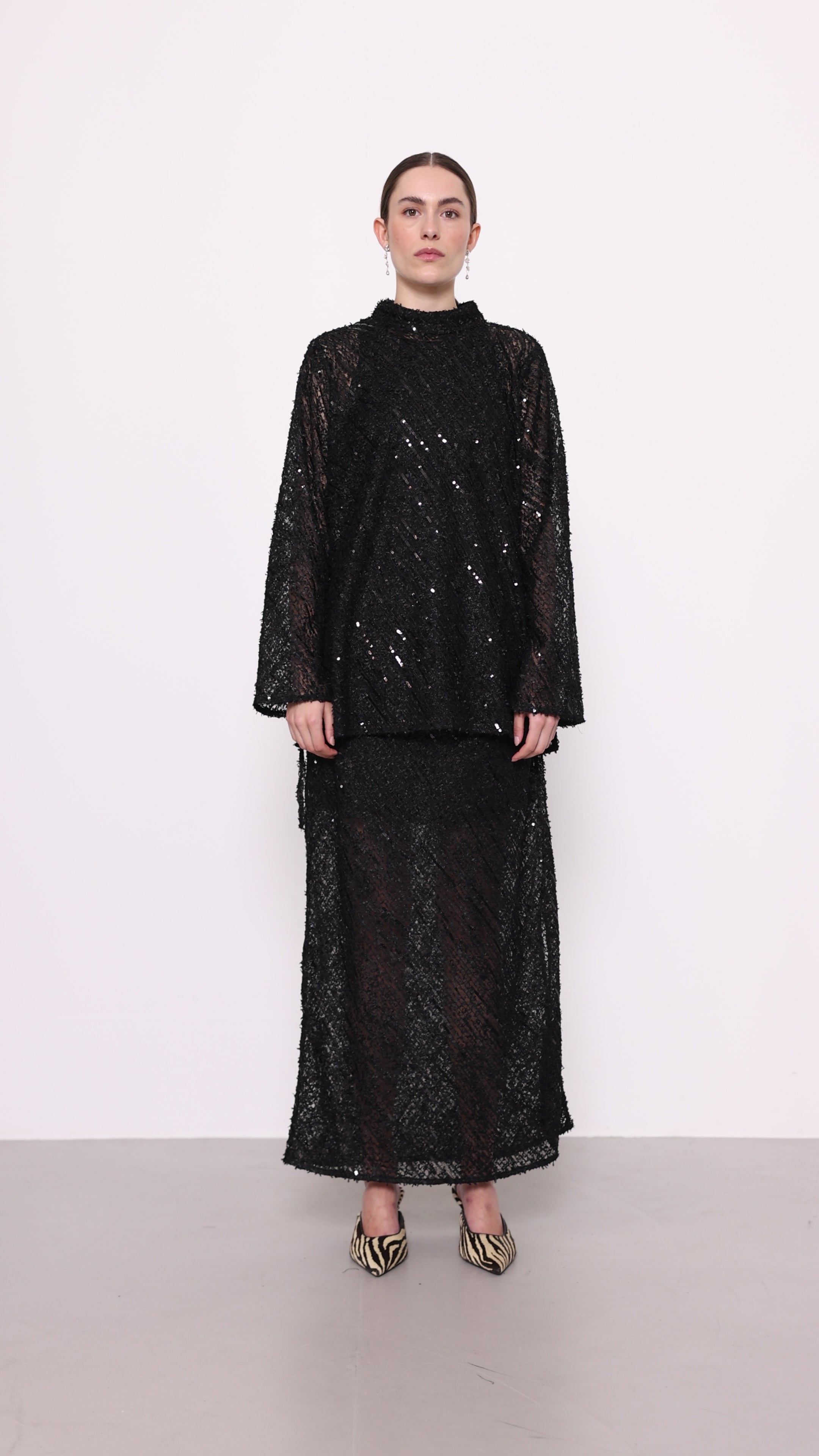 LR-NADIE blusen har en loose-fit pasform med lange ærmer og en høj hals, der understreges smukt af pailletterne der pryder hele modellen. Blusen er halvvejs/see-through og lukkes ved nakken.
