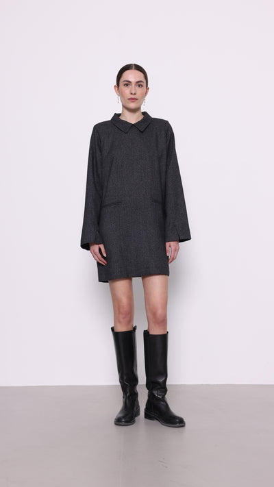 LR-NOLA modellen har et minimalistisk look med en regulær pasform, lange ærmer og kort længde. Kjolen har en spids krave, nøglehulslukning bagpå og et lige, flatterende fald.