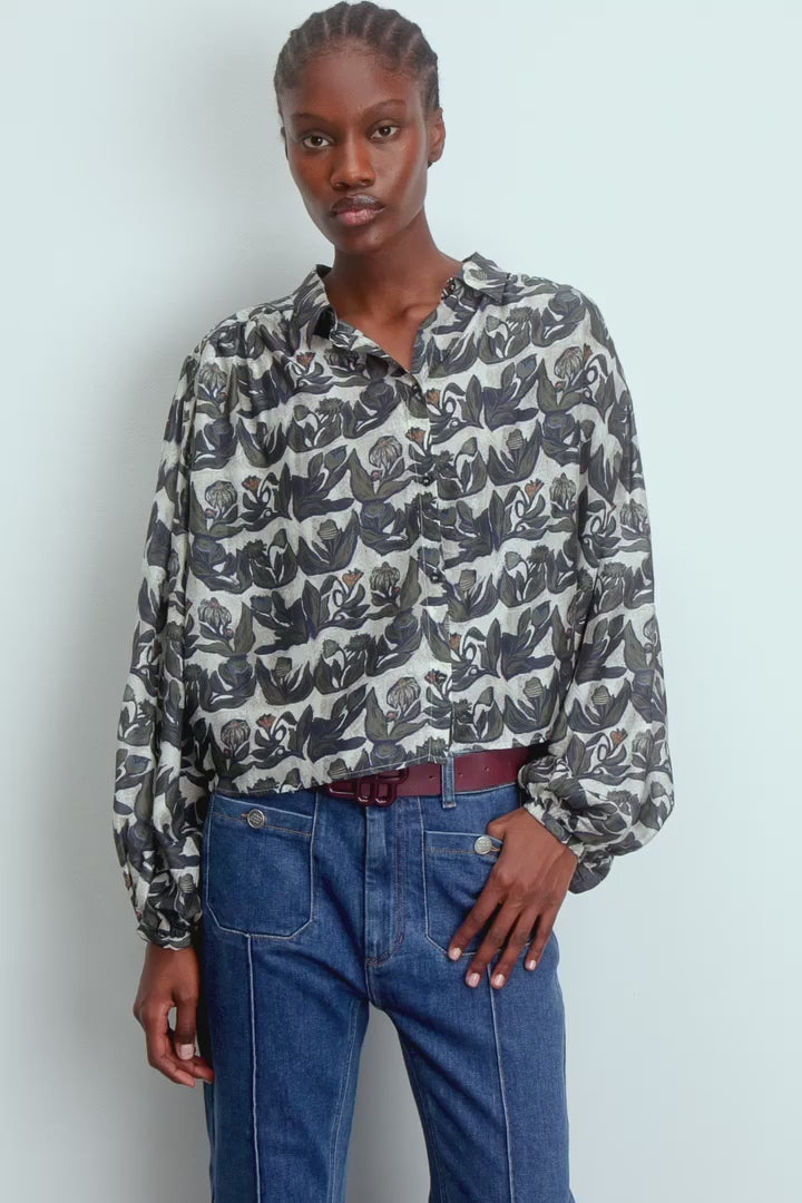 Lynx modellen har en let loose-fit pasform og er prydet med et smukt all-over botanisk print med et materiale af Lenzing Ecovero viskose og silke, som gør den meget komfortabel at være iført. Med lange, voluminøse ærmer, klassisk skjortekrave og knappet midte.