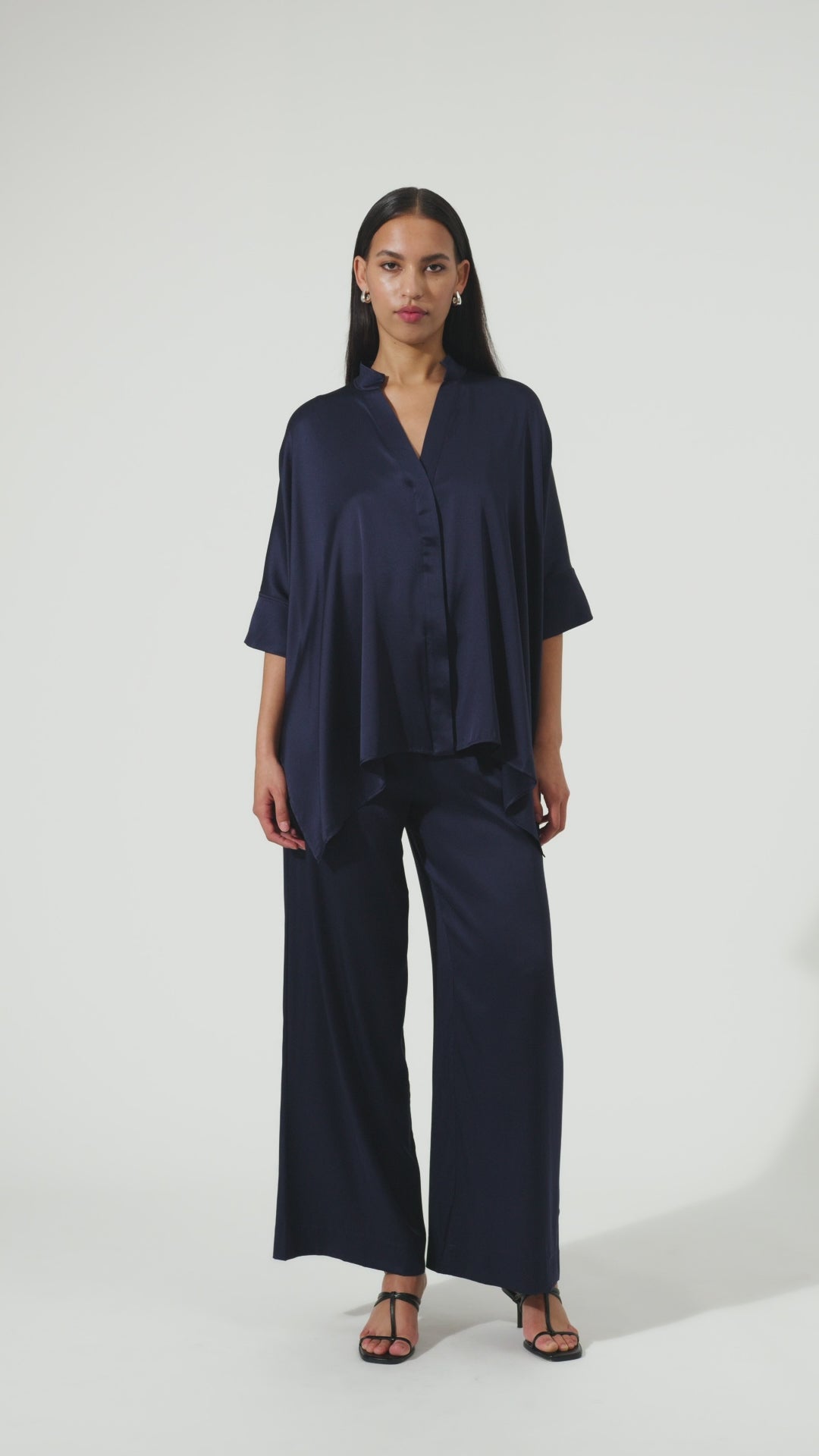 Skjorten er lavet med et loose-fit, har 3/4 ærmer og en skjult knapstolpe langs fronten. Den har en lille V-halsudskæring med ret krave og falder utrolig smukt med de asymetriske sider.