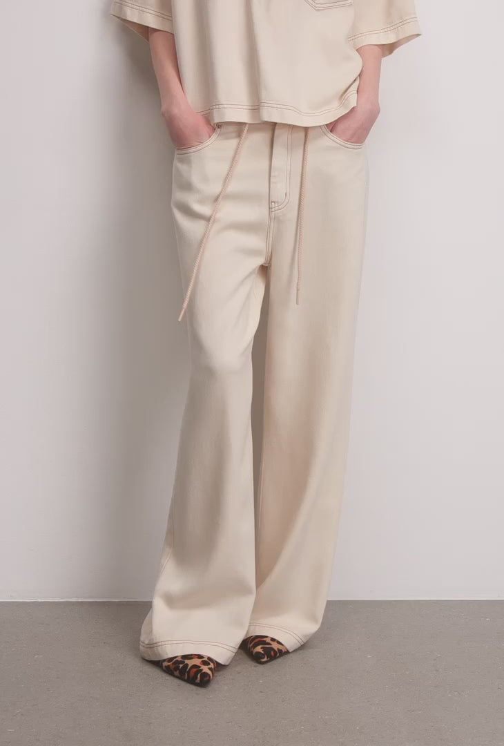 Designet med en loose-fit pasform, lang længde og en middel-høj talje med snøredetalje, som giver modellen er anerledes tvist. Med brede ben og 5 lommer i alt samt logo lap bagpå.