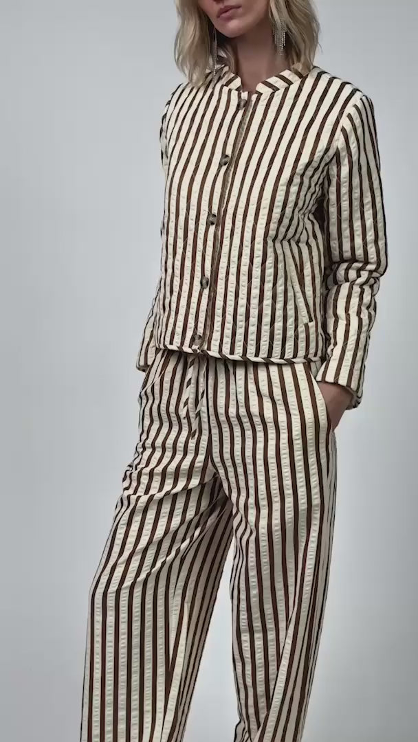 RitaLL bukserne har en afslappet pasform med brede ben og en elastisk talje med bindebånd samt skrålommer. Dette står flot til de lodrette striber i brune og lyse nuancer i bomuldsblanding.