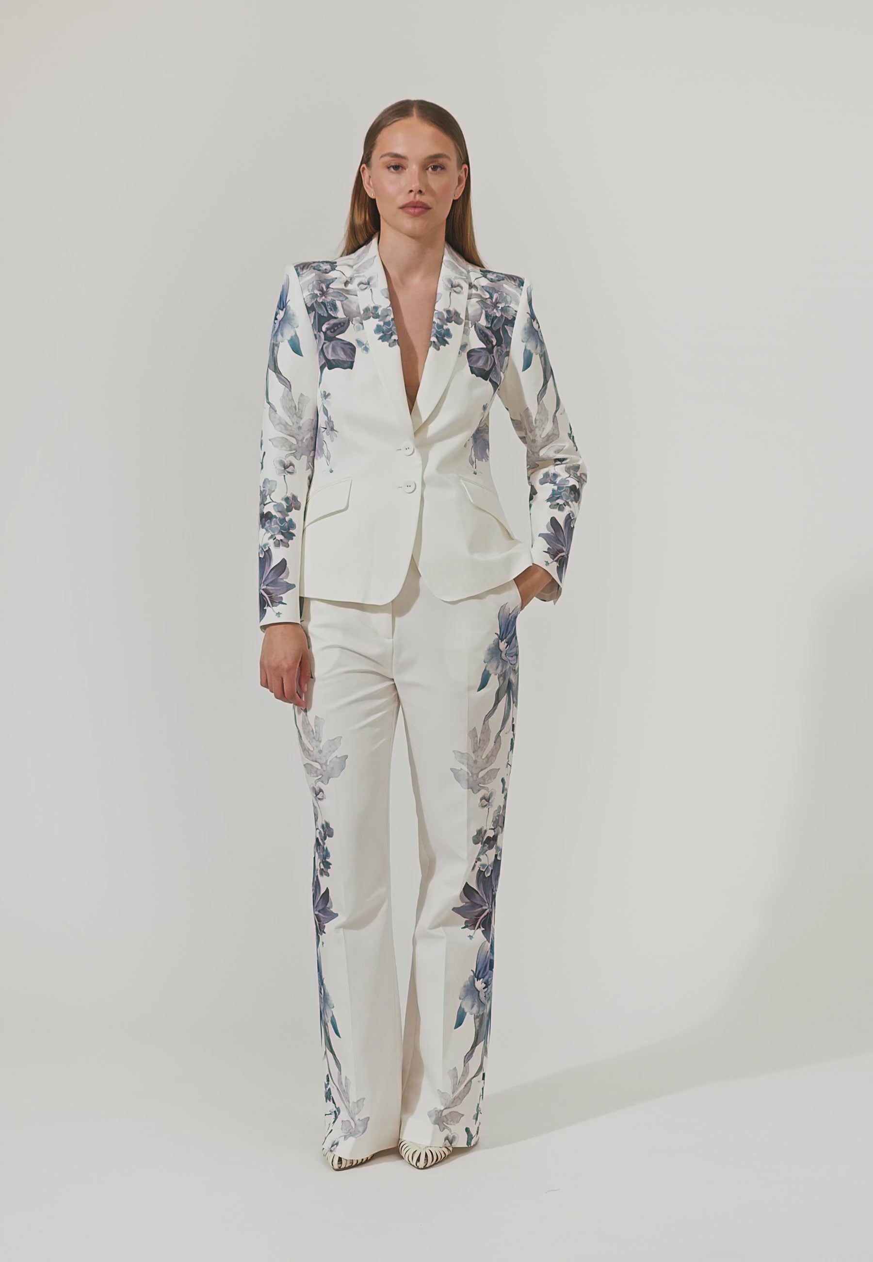 Denne Dea Kudibal blazer har en hvidlig nuance i bomulds- og silkeblanding med smukke blå blomsterguirlander der kaskaderer hen over skuldre, ærmer og ryggen. Blazeren har en skræddersyet pasform, klassisk reverskrave og et enkeltradet design der lukkes med to beklædte knapper.